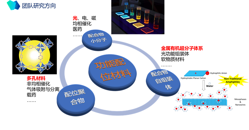 基于配位键构建的金属有机配合物小分子、组装体及聚合物材料的设计、合成及应用研究。