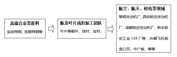 目前已经开发了多个品种的高温合金锻件、带材、丝材等产品,在航空发动机上获得了应用。产品供给黎明发动机厂、西安航空发动机厂、新乡航空工业134厂等、洪都飞机制造公司,中广核等单位。