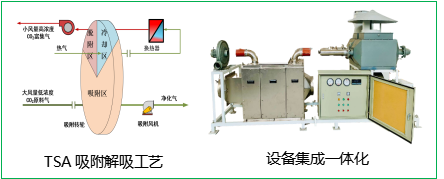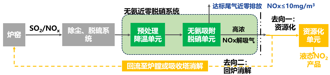 利用自主开发的NOx吸附剂,在常温下对废气中的NO、NO2进行深度吸附净化,再通过升温或变压实现解吸,从而使材料恢复再净化能力,同时得到高浓度的副产物NO2。