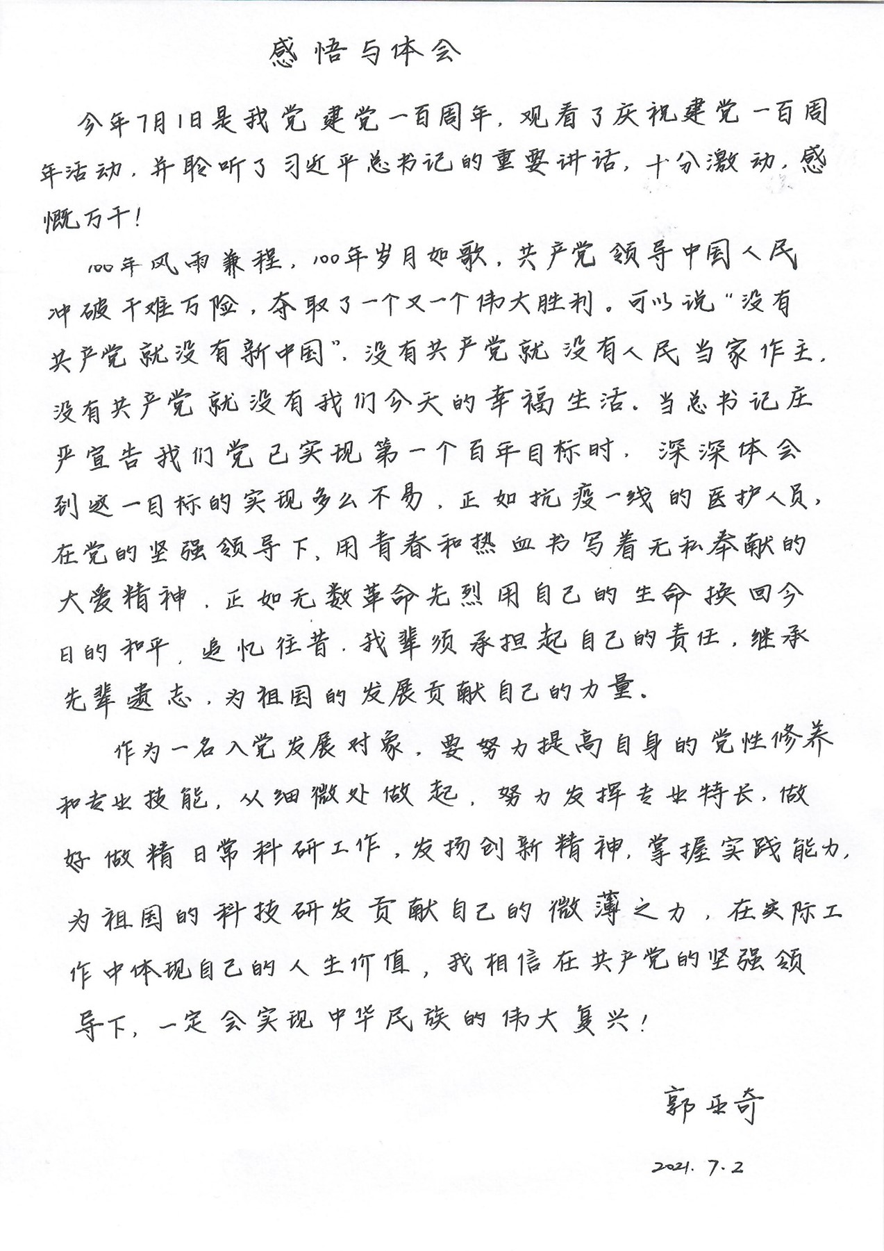 踏上新征程,我要积极响应习近平总书记的号召,牢记初心使命,坚定理想信念。观看中国共产党成立一百周年成立大会时,那一声声整齐划一、震撼天地的“请党放心,强国有我”使我深受感染。我想,每个人都有自己的角色和使命,作为一个科研工作者,我将尽自己的微薄之力,为科技强国事业奋斗终身。