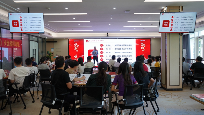 湘江战役是红军长征的壮烈一战,是决定中国革命生死存亡的重要历史事件。通过沙盘模拟推演,学员们作为红军各军团的指挥官,还原真实的历史战争场景,指挥各军团战斗??翁蒙希吃蓖久巧钊胩致劢涣?,在湘江战役的影视片段渲染下,身临其境感受战火硝烟,在亲身参与中感受中国工农红军《湘江战役》的深远意义。