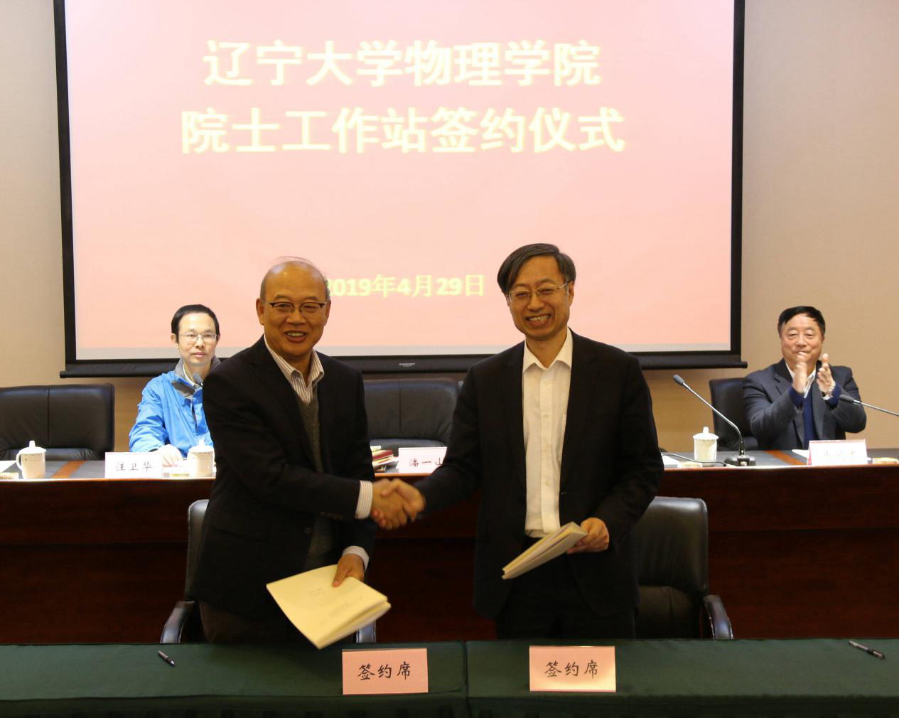 4月29日,松山湖材料实验室与辽宁大学人才培养合作协议签约仪式在辽宁大学蒲河校区顺利举行,辽宁大学校长潘一山、学校党委常委/副校长孙士国、原副校长马凤才、物理学院院长刘魁勇,松山湖材料实验室理事长王恩哥、实验室主任汪卫华、副主任黄学杰及实验室首席科学家付超研究员、陈小龙研究员、杜小龙研究员出席了签约仪式。