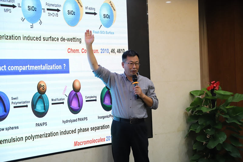 报告中,杨振忠教授为大家介绍了同时具亲油和亲水特性的Janus物质。“Janus的头部具有双面结构,分别朝向过去和未来,与中国的阴阳概念类似,体现了事物的辩证统一”,杨振忠教授用这样生动的比喻来为大家介绍这种奇特的物质。他带领课题组通过利用单分散二氧化硅在Pickering乳液油水界面分区特性,结合双相原子转移自由基聚合,制备了有机/无机复合Janus球形胶体,由于其界面双亲性环境,可以应用在新材料、能源环境及生物医用等方面,在治理环境污染、污水净化、水资源循环利用等方面具有十分广泛的应用前景。