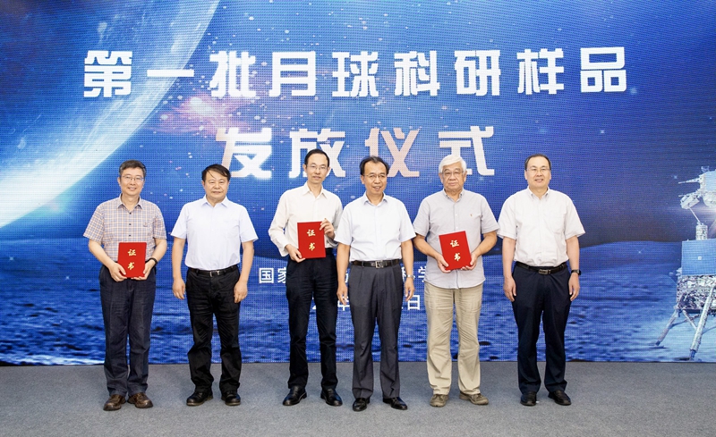 国家航天局探月与航天工程中心主任、探月工程副总指挥刘继忠、中国科学院前沿科学与教育局苏刚局长分别致辞。国家航天局探月与航天工程中心此次共发放首批月球科研样品17.4764g,分别由13家科研机构获得,中国空间技术研究院获得了其中的8.00g月球样品。汪卫华研究员代表中国空间技术研究院领取了月球样品使用证书。