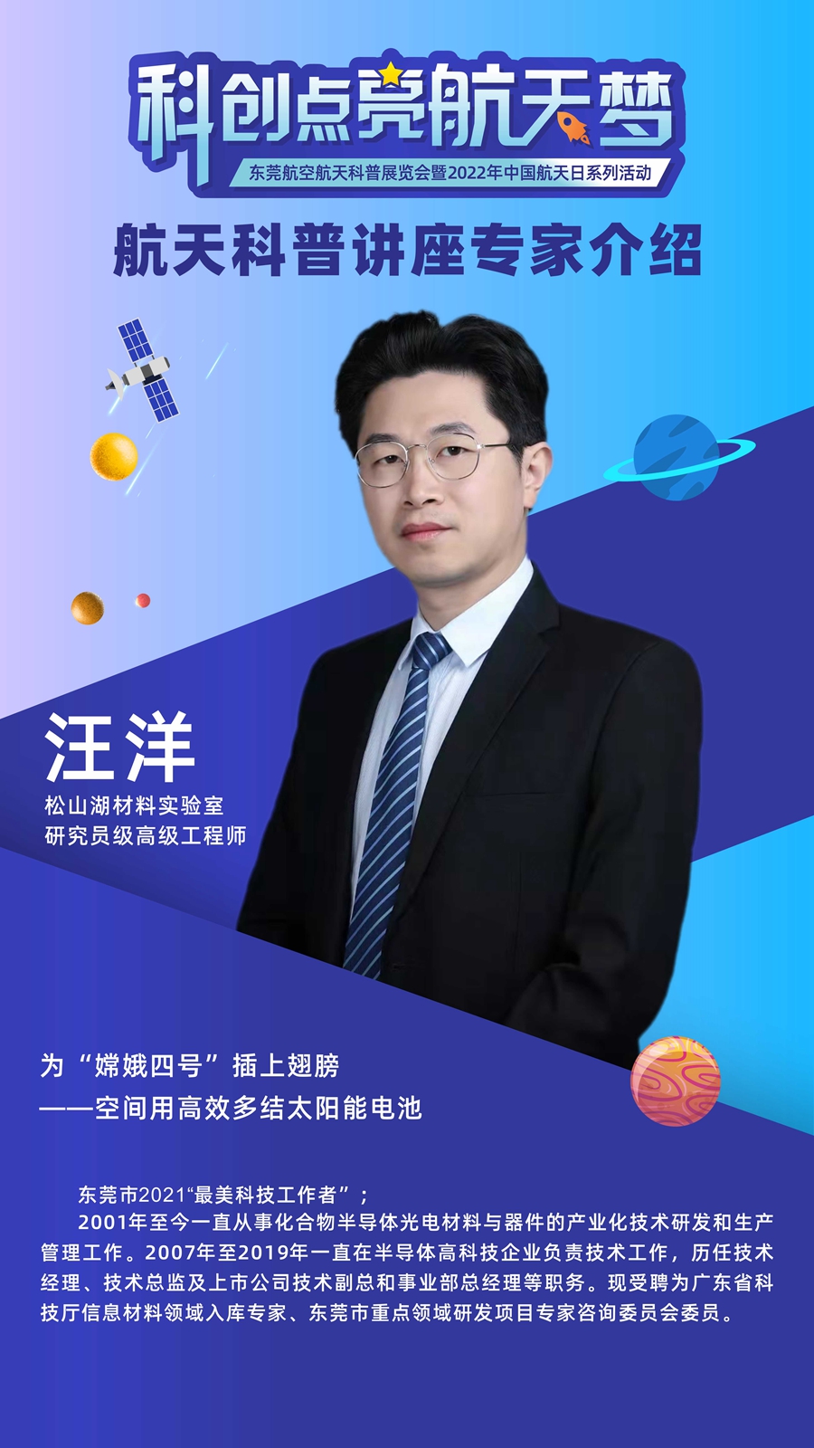 4月24日“中国航天日”当天,东莞市2021“最美科技工作者”、实验室研究员级高级工程师汪洋受邀讲述了太空新能源方面的科普知识。