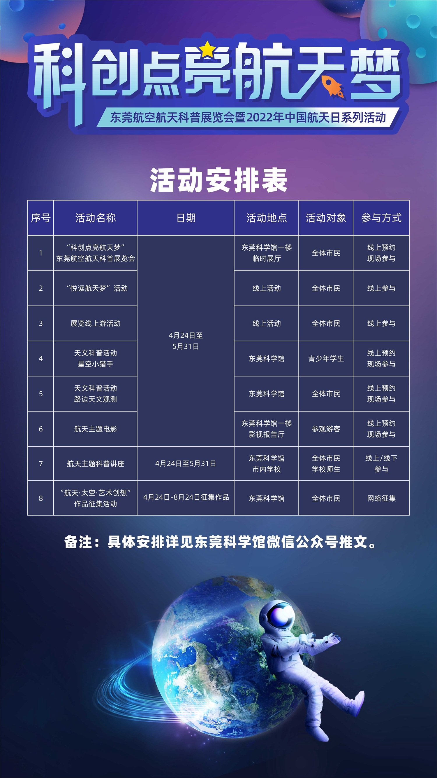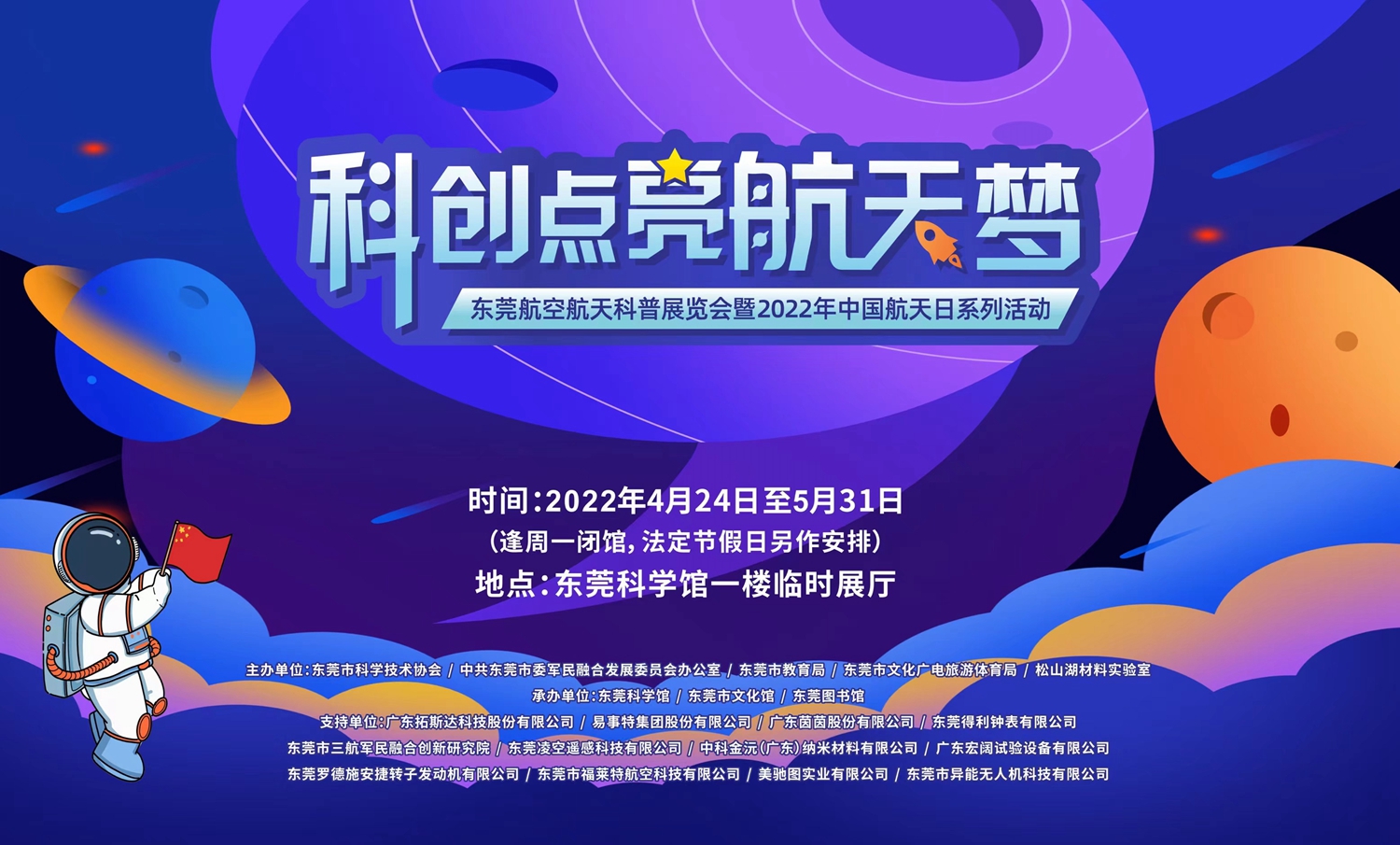 在第七个“中国航天日”来临之际,东莞市科学技术协会携手松山湖材料实验室、中共东莞市委军民融合发展委员会办公室、东莞市教育局、东莞市文化广电旅游体育局,联合主办东莞航空航天科普展览会暨2022年中国航天日系列活动,用科创点亮航天梦!