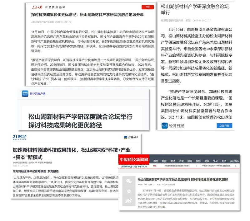 2023年11月10日,由国投创合基金管理有限公司、松山湖材料实验室主办的松山湖新材料产学研深度融合论坛在广东东莞松山湖材料实验室举行。国投创合邀请来自全国各地30余家深耕新材料产业的领先投资机构参会,与科研院校专家、新材料领域创新型企业及政府机构代表等一同探讨加速科技成果转化的新路径、新模式。松山湖材料实验室同期发布并介绍项目引进指南。