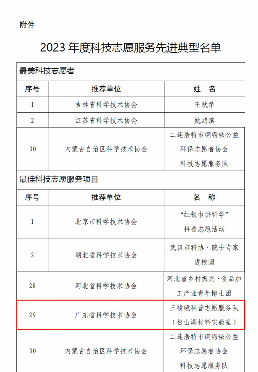 日前,中国科协印发《关于2023年度科技志愿服务先进典型的公示》,来自松山湖材料实验室的三棱镜科普志愿服务队入选最佳科技志愿服务组织。