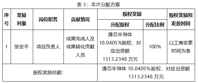 依据《松山湖材料实验室科技成果转化管理办法》第十六条规定,材料实验室获得清芯半导体13.6205%的股权中的73.7160%作为股权奖励,合计1313.2348万元,占清芯半导体10.0405%的股权。11项职务科技成果的发明人包括张安平、夏经华、陈昭铭、殷鸿杰、袁朝城、罗惠馨、刘鸣然,其中夏经华、陈昭铭、殷鸿杰、袁朝城、罗惠馨、刘鸣然已书面放弃对上述职务科技成果转化的收益。本次分配的具体方案如下: