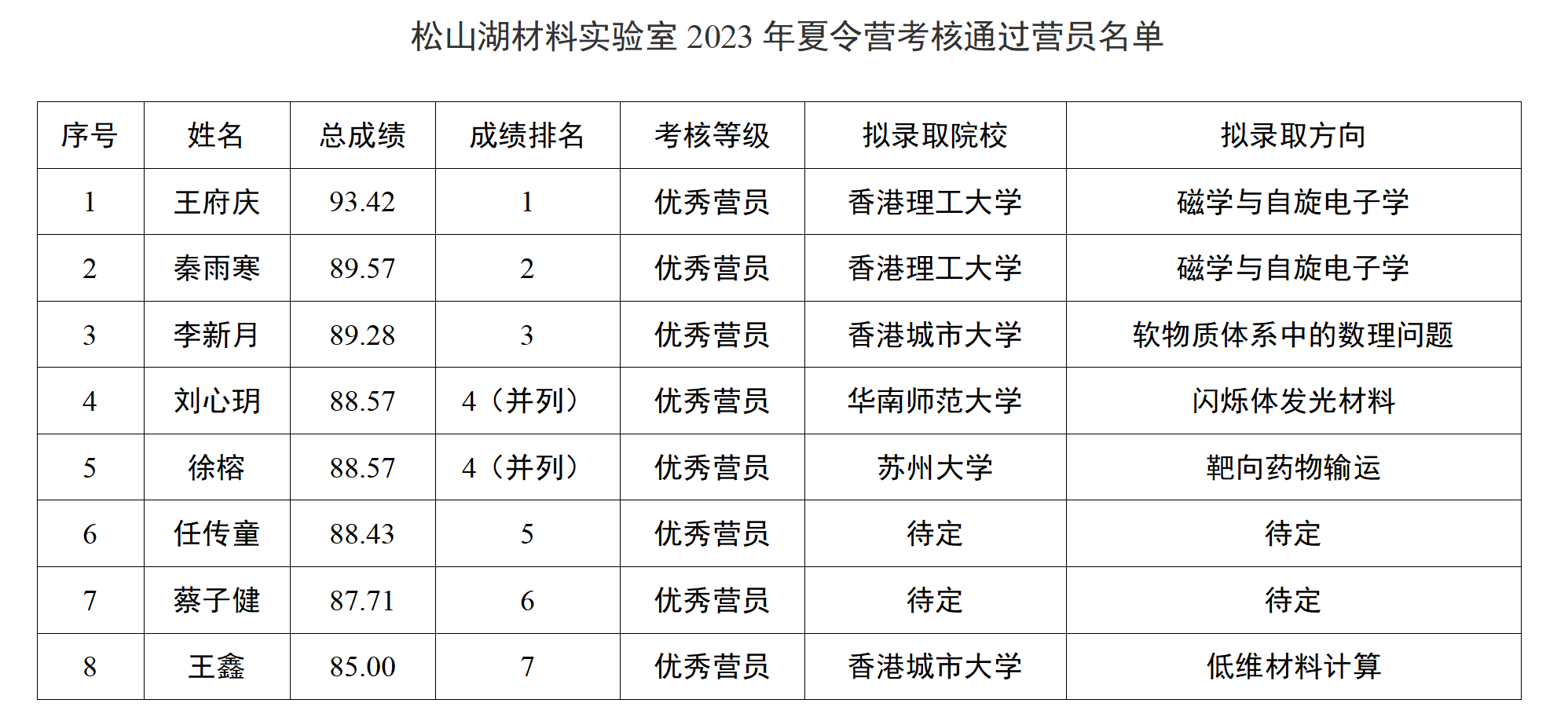 松山湖材料实验室于2023年7月7—10日举办了夏令营活动,经实验室招生工作领导小组面试、评分,现将通过夏令营考核的同学名单予以公示(见下表)。公示期为7月31日—8月13日(10个工作日)。