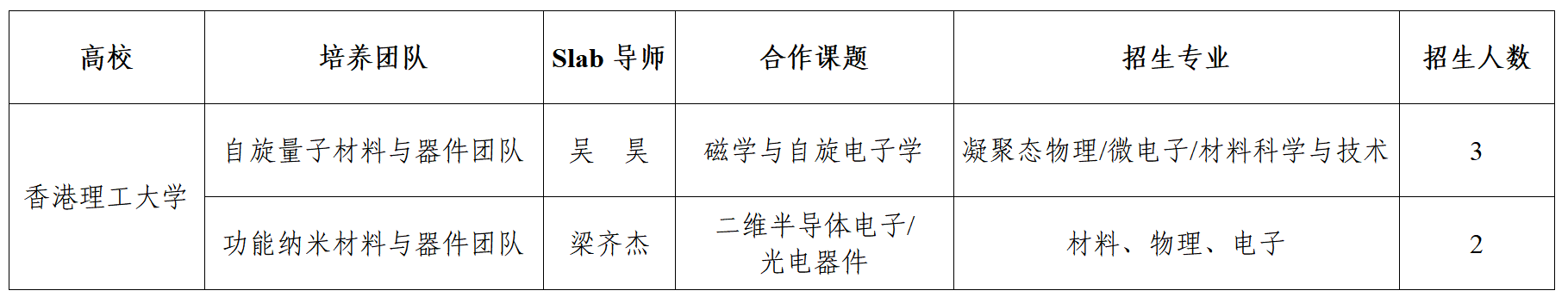 为培养具有国际视野的理工科拔尖创新人才,加强双方科研合作,利用双方现有的学术优势、资源和设施,实现人才培养优势互补,经松山湖材料实验室(下称“Slab”)与香港理工大学(下称“PolyU”)协商,决定开展联合培养博士研究生合作,本次招生录取的同学将于2024年9月入学香港理工大学。联培项目招生工作即日启动,报名截止日期为2023年12月25日,欢迎优秀学子踊跃申请!