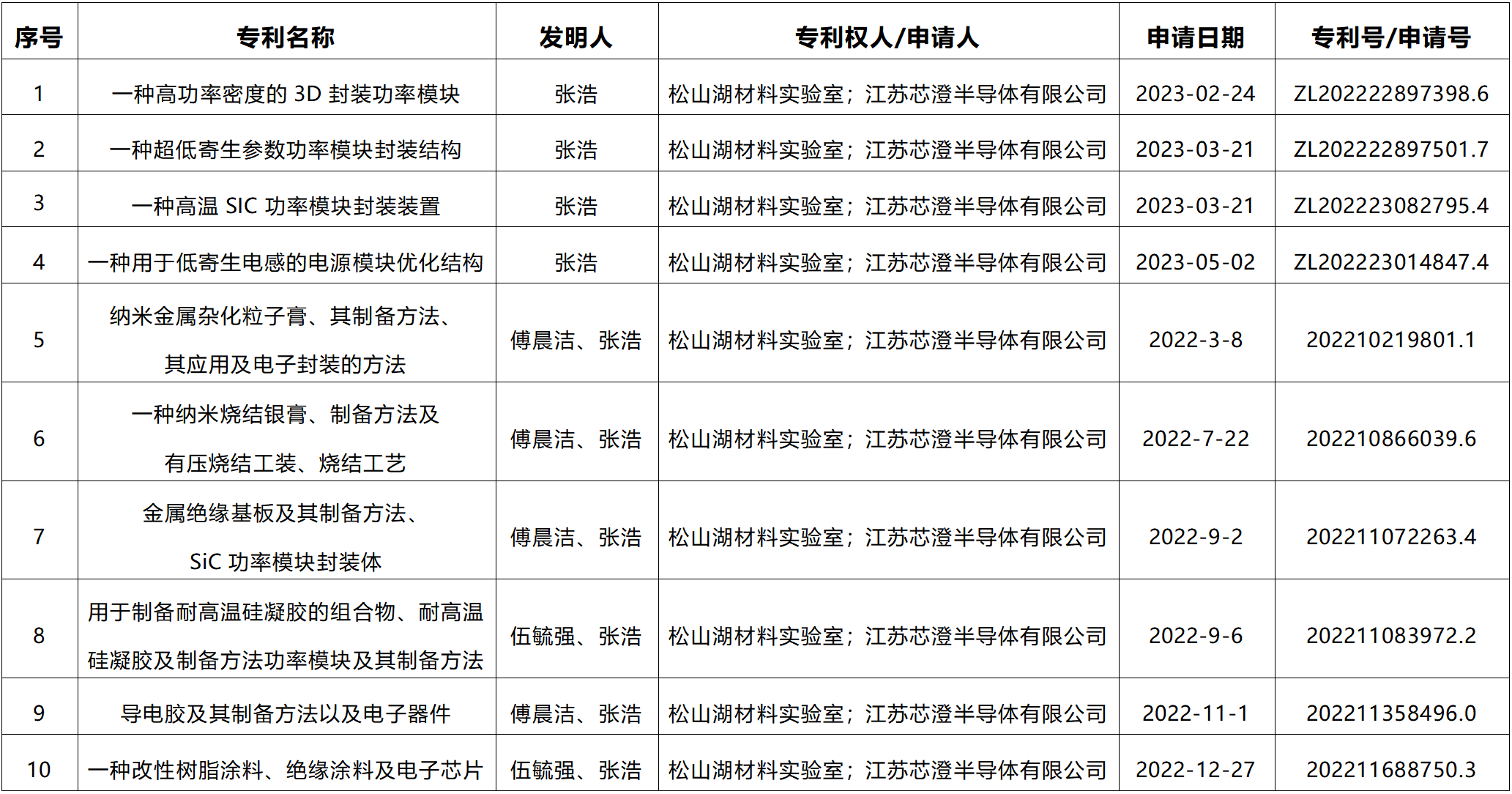 根据《松山湖材料实验室科技成果转化管理办法》规定及松山湖材料实验室与江苏芯澄半导体有限公司签署的《松山材料实验室-江苏芯澄半导体有限公司共建联合工程中心合作协议书》约定,现对松山湖材料实验室(以下简称“材料实验室”)SiC功率??榧际跬哦?ldquo;金属绝缘基板及其制备方法、SiC功率??榉庾疤?rdquo;等10项专利及专利申请科技成果(以下简称“项目科技成果”)(表1)转化股权奖励相关信息公示如下:
