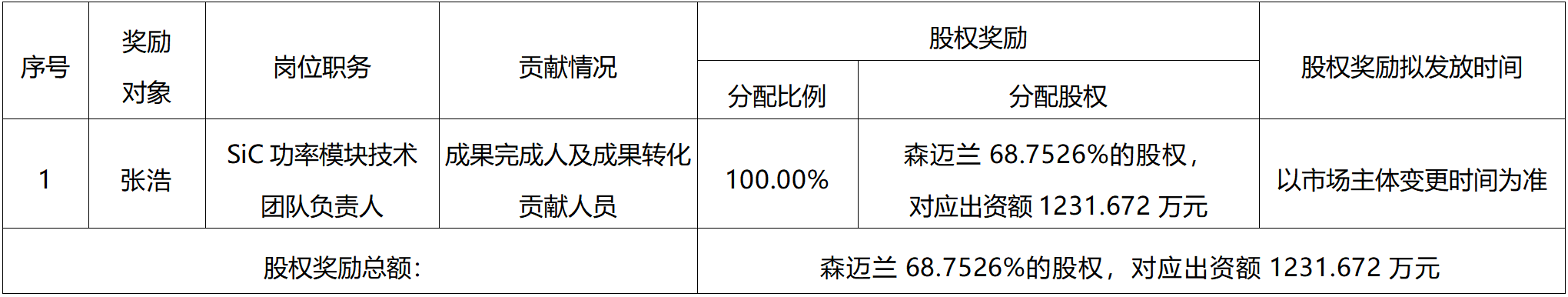 依据《松山湖材料实验室科技成果转化管理办法》第十六条及材料实验室与江苏芯澄半导体有限公司签署《松山材料实验室-江苏芯澄半导体有限公司共建联合工程中心合作协议书》第十七条规定,以上科技成果作价入股获得森迈兰85.9407%的股权中的80%作为股权奖励(合计1231.672万元,占森迈兰68.7526%的股权)。10项职务科技成果的发明人包括张浩、傅晨洁、伍毓强,其中傅晨洁、伍毓强已书面放弃对上述职务科技成果转化的收益。本次分配的具体方案如下: