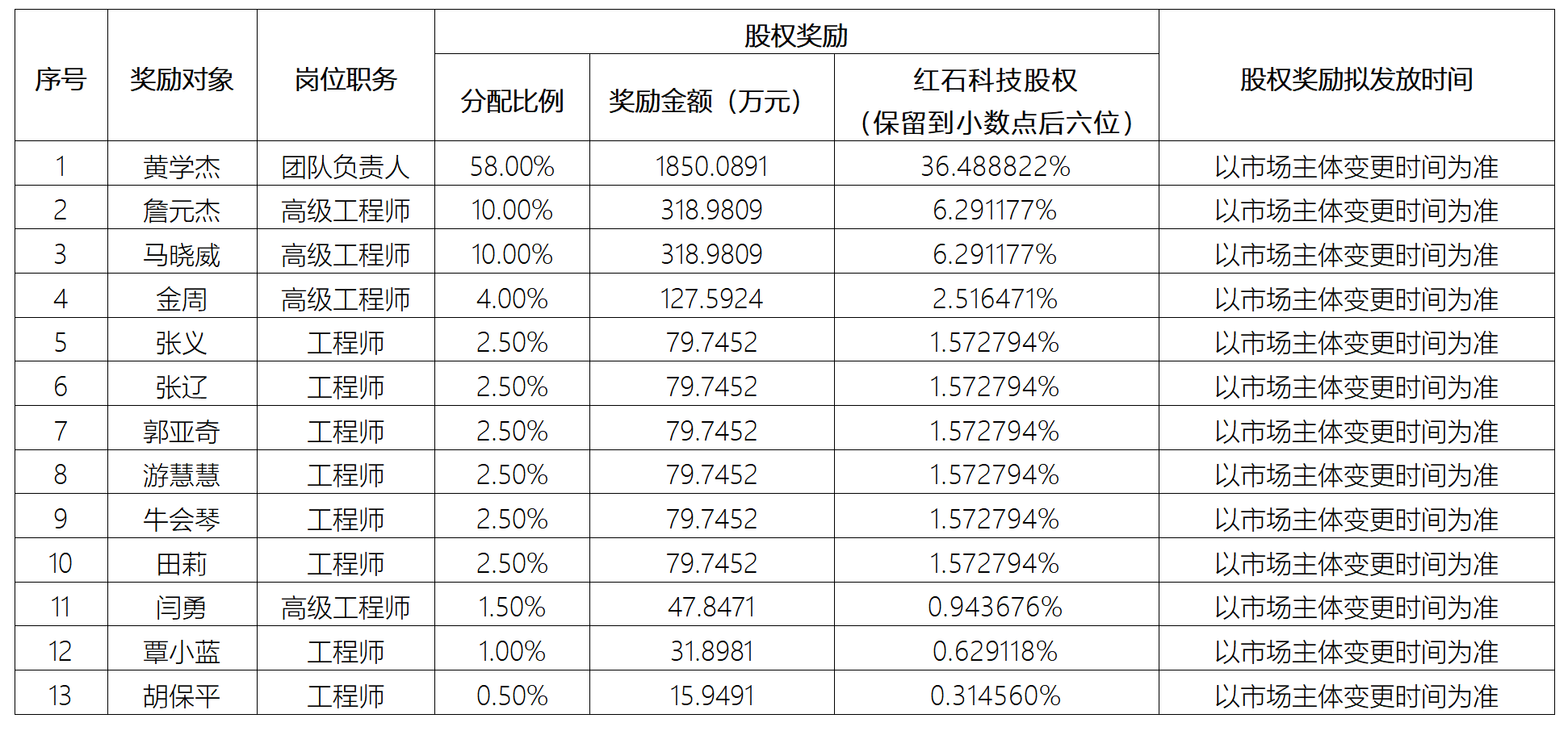 依据《松山湖材料实验室科技成果转化管理办法》第十六条规定,以材料实验室获得的红石科技股权中的80%作为股权奖励(合计3189.8088万元股权)。33项职务科技成果的完成人及成果转化贡献人员包括黄学杰、詹元杰、马晓威、金周、张义、张辽、郭亚奇、游慧慧、牛会琴、田莉、闫勇、覃小蓝、胡保平、武怿达,其中武怿达已书面放弃对相关专利及专利申请权的权利和义务,不再参与本次分配。本次奖励分配的具体方案如下: