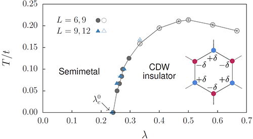 | 图1. 狄拉克费米子 Holstein 模型相图,横轴为电声子耦合强度,纵轴为温度。耦合弱的时候,系统为狄拉克半金属(Semimetal);耦合强时,声子的量子涨落引起电子有效吸引作用,狄拉克费米子局域化成为电荷密度波绝缘体(CDW insulator )。由于 CDW 破缺 A,B 子晶格的 Z2 对称性,有限温度下的相变为 2D Ising 相变,零温的相变为 (2+1)D Gross-Neveu Ising 相变。 |