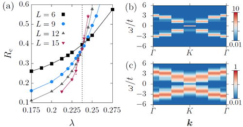 | 图2. (a) 运用关联比(correlation ratio)确定半金属-CDW绝缘体量子相变的位置。系统尺度(L)越大,蒙特卡洛计算的难度也就越大。(b) 在半金属中的单粒子谱函数,在动量 K 点处没有能隙,线性色散的狄拉克费米子是稳定的。(c) 在 CDW 绝缘体中的单粒子谱函数,在动量 K 点处由声子的涨落引起电子之间的有效相互作用,打开了能隙。狄拉克费米子不复存在。 |
