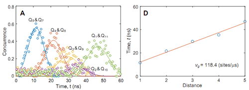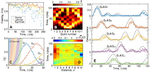 图三. 单粒子激发时量子纠缠的演化,量子比特(5,7)间先产生了纠缠,接着更远距离的量子比特间产生了纠缠,一直到两个端点第1和第11个量子比特间的纠缠,量子纠缠在一维链中进行传递和震荡,在此器件中其传递速度为每微秒118.4个格点,此图来自文章附件材料。