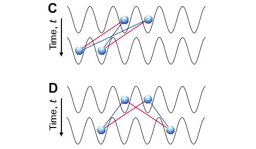 图五. 一维格点双激发聚束及反聚束分别对应玻色子和费米子性质,其运动轨迹分别表现为玻色子化的同向运动和费米子化的反向运动,此图来自文章正文。