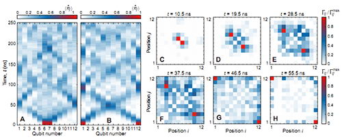实验分别展示了单粒子激发和双粒子激发量子行走,单粒子激发利用了器件中的11个量子比特,先将所有的量子比特初始化到基态,激发其中一个量子比特,分别选择两端的量子比特或中间即第6个量子比特,进行时间演化并进行单发(single shot)测量。对双粒子激发量子行走,用全部12个量子比特,选择中间两个量子比特即第6,7量子比特或者两端的量子比特进行激发,同样进行时间演化和测量。