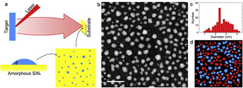 | 图1. PdSi纳米颗粒构成的超薄膜。(a)制样过程与样品形貌示意图(b)为球差电镜下的颗粒状薄膜形貌,标尺为10nm,(c)纳米颗粒的尺寸分布,(d)非晶态与含有晶态结构颗粒的区分,红色为纯非晶颗粒,蓝色为含有晶态结构的颗粒。 |