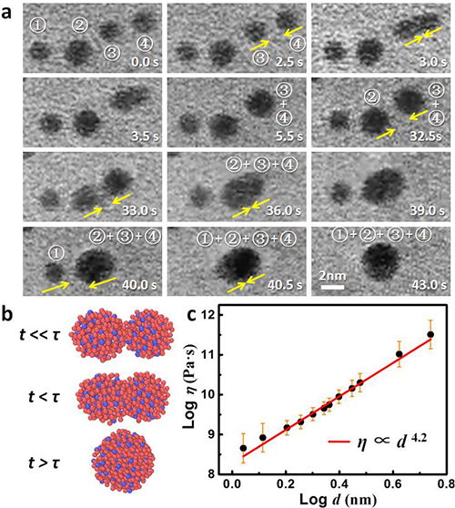 | 图2. 非晶纳米颗粒的类液体动力学行为(a)在高分辨电镜连续拍照条件下拍摄的四个纳米颗粒的合并过程,(b)颗粒合并模型示意图,(c)为纳米颗粒粘度与尺寸呈现的幂律关系 |