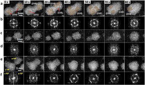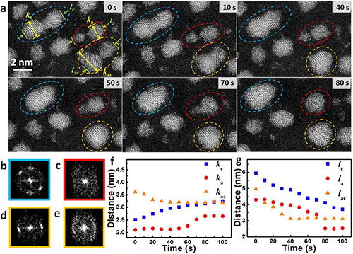 | 图4. 球差电镜观测图3中三类纳米颗粒合并随时间演化的详细过程 |