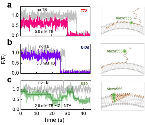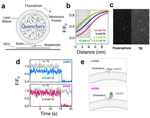 膜蛋白在细胞代谢中起着至关重要的作用。研究膜蛋白特定区域在生物膜上的位置,尤其是沿垂直于膜方向的位置及其动态变化,对于理解膜蛋白的功能及相关的分子机制有重要意义。一些传统的生物物理技术如核磁共振(NMR)等可以给出时间和系综平均的数据,但如何实时追踪单个膜蛋白在约4纳米厚的膜内或膜表面几纳米范围内的动力学过程,仍然是一个挑战。