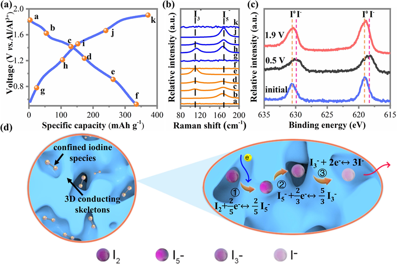 近日,松山湖材料实验室柔性及锌基电池团队首次研究了碘正极在水系铝离子电池中的转化反应化学(I2 ↔ I5-↔ I3-↔ I-)。由于 “water-in-salt”水系电解液可以帮助解决离子液体离子电导率低,极化大等问题,水系铝-碘电池有着更高的电压平台和更大的放电容量。此外,将易溶解的碘限域在金属有机框架衍生的氮掺杂多孔碳中(I2@ZIF-8-C),能够有效地提高碘的热力学稳定性,获得稳定的固-液转化反应。所得到水系铝-碘电池具较高的放电比容量 (219.8 mAh g-1) 和优异的倍率性能 (8A g-1电流密度下容量约102.6mAh g-1)。该研究通过合理的设计,获得了倍率性能好、成本低廉和安全性高的水系铝碘电池,为新型卤素电池体系的开发提供了新的思路。