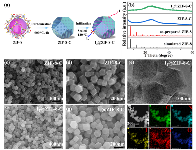 图1. (a) I2@ZIF-8-C合成过程示意图;(b) ZIF-8、ZIF-8-C和I2@ZIF-8-C的XRD图; (c) 和 (d) ZIF-8-C 在不同放大倍数下的 SEM 图像; I2@ZIF-8-C 的 (e) TEM 图,(f) 和 (g) 不同放大倍数的 SEM 图像; (h) EDS能谱图
