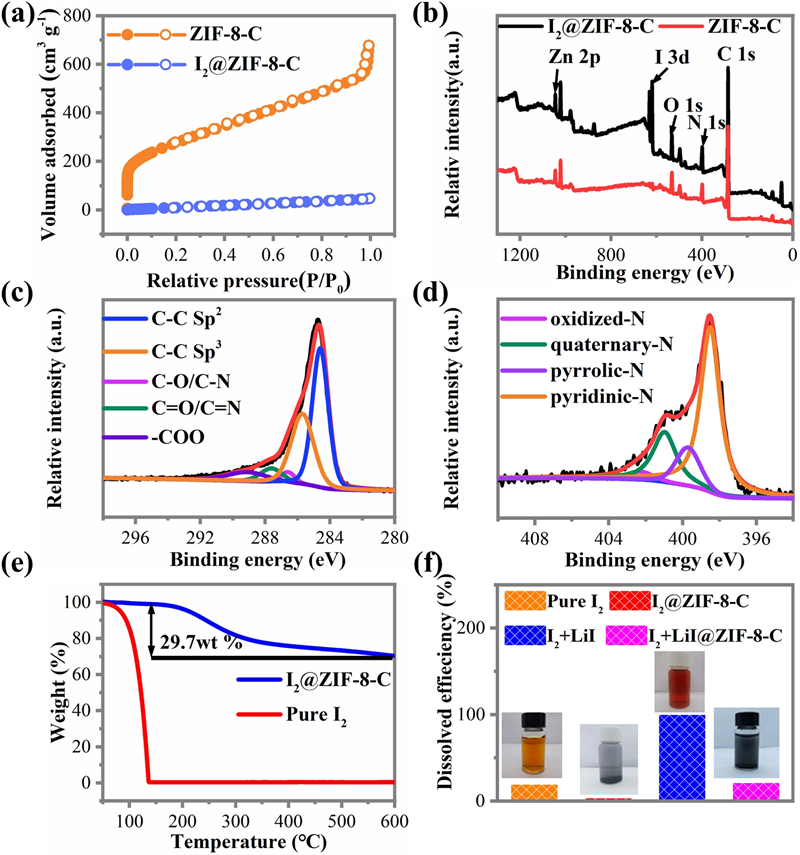 图2. I2@ZIF-8-C和ZIF-8-C的 (a) 氮气吸附曲线和(b) XPS图;(c),(d)不同元素高分辨XPS图; (e) I2@ZIF-8-C和ZIF-8-C样品的热重曲线;(f)不同样品的溶解率和光学照片。