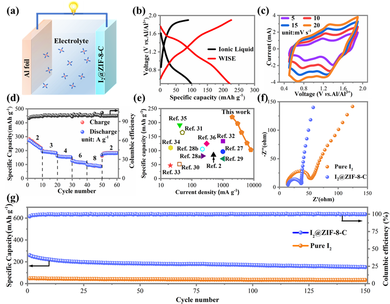 图 3. (a) 水系铝离子电池示意图;(b) 不同电解液铝-碘电池恒流充放电曲线;(c) Al//I2@ZIF-8-C 电池在不同扫描速率下的 CV 曲线; (d) 水系 Al//I2@ZIF-8-C 电池的倍率性能; (e)I2@ZIF-8-C正极和其他铝离子电池正极材料的不同电流密度下容量对比图。 I2和 I2@ZIF-8-C正极的 (f) EIS 曲线和 (g) 循环性能。