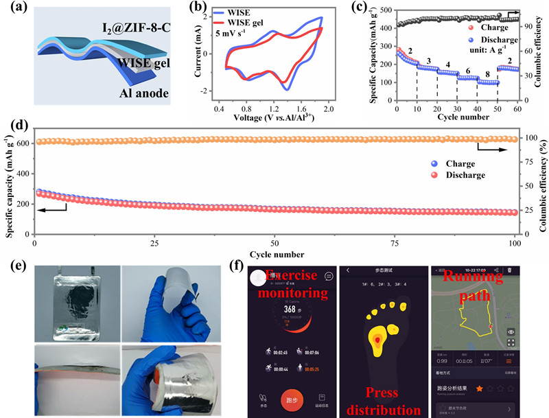图 5. (a) 柔性 Al//I2@ZIF-8-C 电池示意图;(b) Al//I2@ZIF-8-C 使用液态和凝胶电解质的CV 曲线;柔性Al//I2@ZIF-8-C电池的 (c) 倍率性能和 (d) 循环性能; (e) 柔性 Al//I2@ZIF-8-C电池供电的智能鞋垫照片。 (f) 由柔性电池供电的智能鞋垫进行运动监测(左)、压力分布(中)和跑步路径(右)。