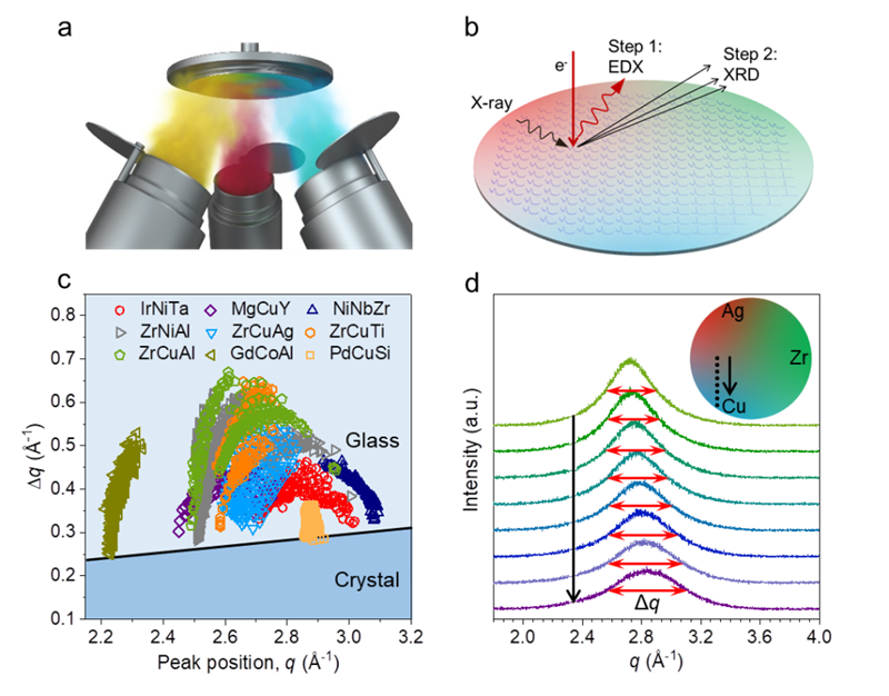 图1. 非晶合金高通量研发流程,包括组合材料制备、自动化成分分析和结构表征、衍射峰自动分析。数据表明,XRD衍射第一峰的峰宽Δq随成分逐步变化。