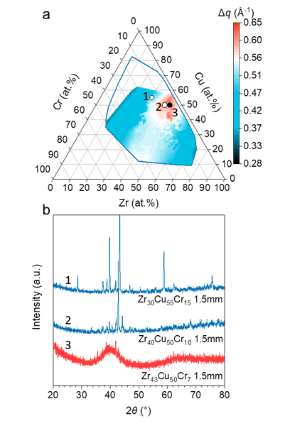 图4. 利用Δq-GFA判据,在ZrCuCr合金体系中发现了可形成块体非晶合金的新材料。
