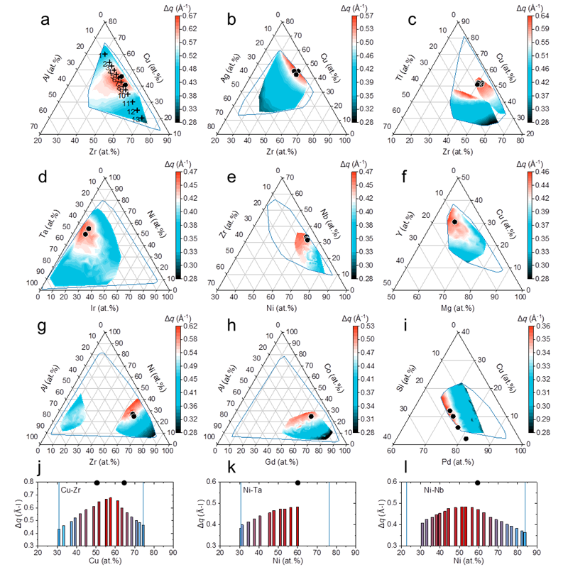 图2. Δq在12种典型的非晶合金体系中的分布,其中红色区域为Δq的最大值,黑色的圆点为文献报道的GFA最强的合金成分。