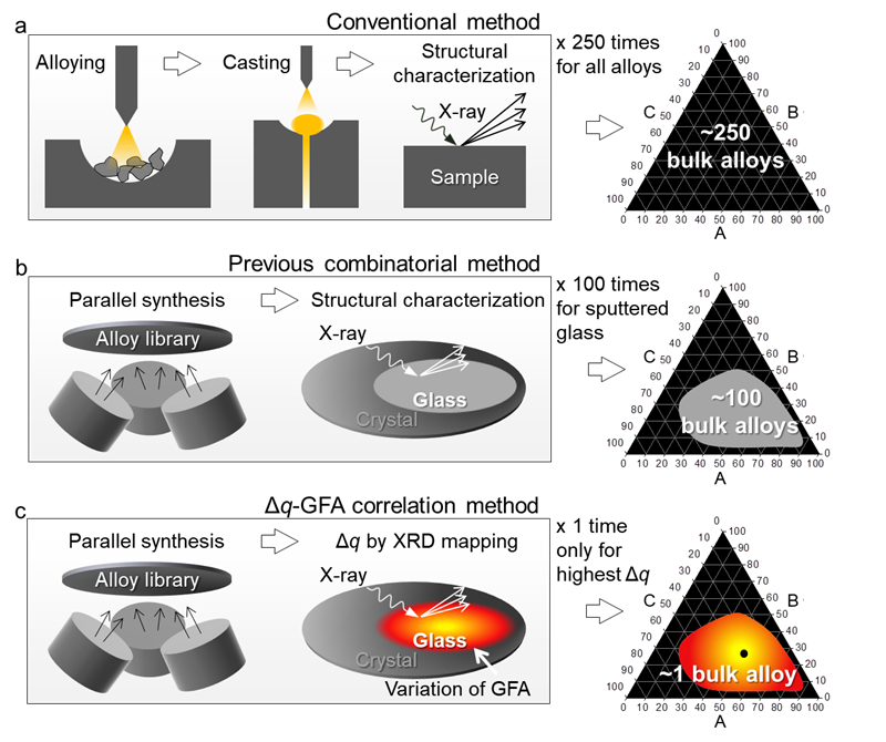 图3. 三种非晶合金开发方法的效率对比。对于一个三元合金系,常规的试错法需要制备、表征约250个块体合金;先前的高通量方法可将块体合金的制备数量降低至100个;Δq-GFA可将块体合金的制备数量降低至个位数。