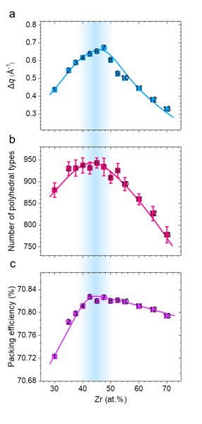 图5. Zr-Cu-Al合金的分子动力学模拟结果。随Zr含量的变化,Δq、团簇构型种类、密堆度呈相似的变化趋势。