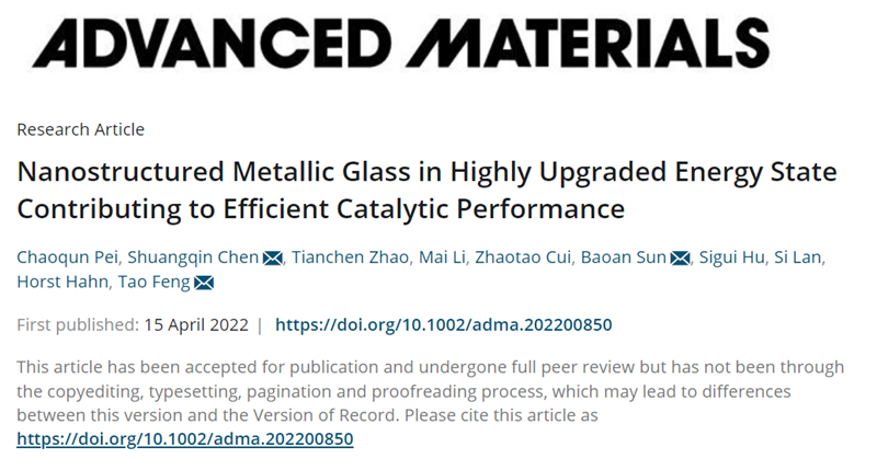 Chaoqun Pei#, Shuangqin Chen#*, et al. Nanostructured Metallic Glass in Highly Upgraded Energy State Contributing to Efficient Catalytic Performance. Advanced Materials, 2022,DOI: 10.1002/adma.202200850