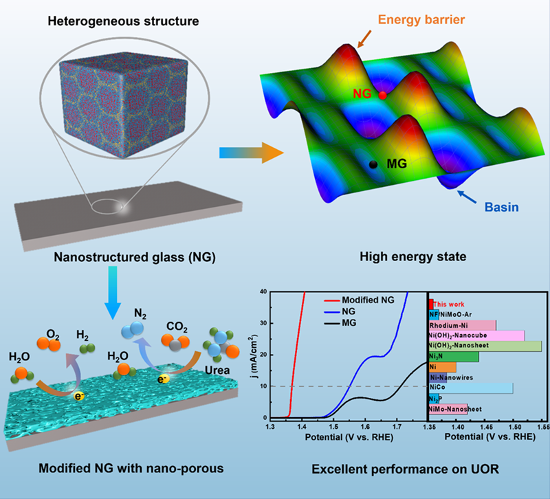 针对以上关键科学问题,松山湖材料实验室团队联合其他合作者经过深入研究,设计出一种具有高能量状态的纳米结构非晶合金(Ni-P NG)催化剂。该项研究具有以下亮点:(1)通过脉冲电沉积法制备的Ni-P NG具有高度的结构非均匀性特点,使得Ni-P NG具有极高的能量状态; (2)具有高的能量状态的纳米结构非晶合金显著提高了其催化性能;(3)此外,具有非均匀性结构的Ni-P NG是制备独特的蜂窝状纳米孔结构的理想前驱体,在尿素氧化反应(UOR)中表现出优异的催化性能,具体表现为在10 mA/cm2的电流密度下,改性的Ni-P NG的电势仅为1.36 V, Tafel斜率为13 mV/dec,这是Ni基合金中UOR性能最好的新型材料。