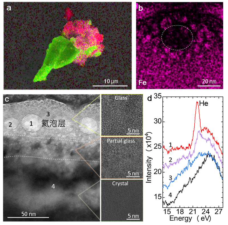 图1(a)EDS显微图,一颗形似康乃馨花的月壤钛铁矿颗粒(花托部分)和粘接的胶结物质(花冠)。(b)透射电镜下观测到的一个氦气泡的放大图,红色为Fe元素分布情况。(c)月壤钛铁矿表面形成了玻璃层,氦气泡主要在玻璃层中。(d)图(c)中不同位置的电子能量损失谱曲线。