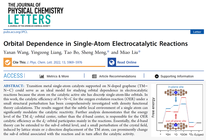 近日,松山湖材料实验室/中国科学院物理研究所孟胜研究员和刘淼副研究员团队,在国际权威期刊《The Journal of Physical Chemistry Letters》上发表了题为“Orbital Dependence in Single-Atom Electrocatalytic Reactions”的研究论文,提出催化性能主要取决于参与反应的部分d亚层轨道,解决了d带理论和前沿轨道理论一直以来的争议。值得一提的是,该论文还被编辑推荐作为封面文章发表。