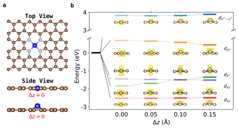 图1(a)TM−N−C单原子催化剂的原子结构图。(b)TM−N−C在晶体场下的d能带劈裂