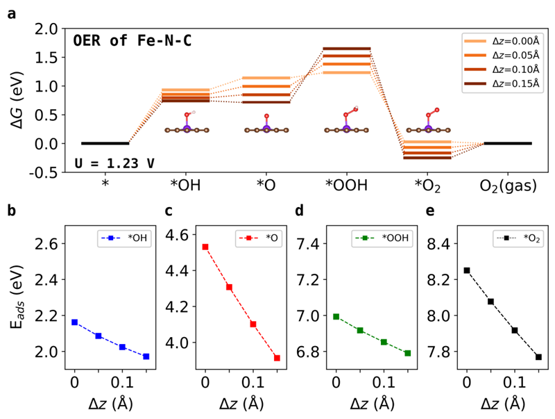(b-c)Fe−N−C体系OER过程中的*OH,*O,*OOH,和*O2四个中间态的吸附能随z方向位移的变化情况。