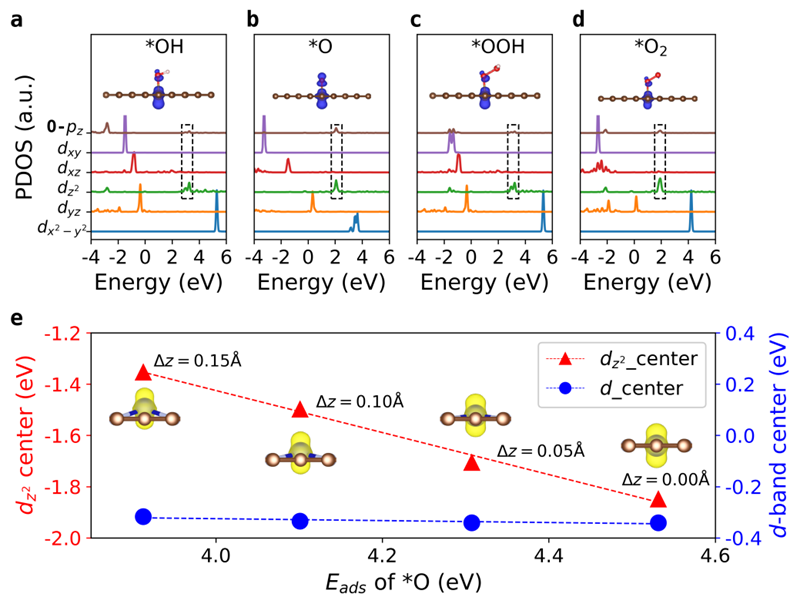 (e)当Fe−N−C的z方向位移从0增加到0.15 Å时,O原子的吸附能与Fe原子的dz2轨道中心和d带中心的相关性。