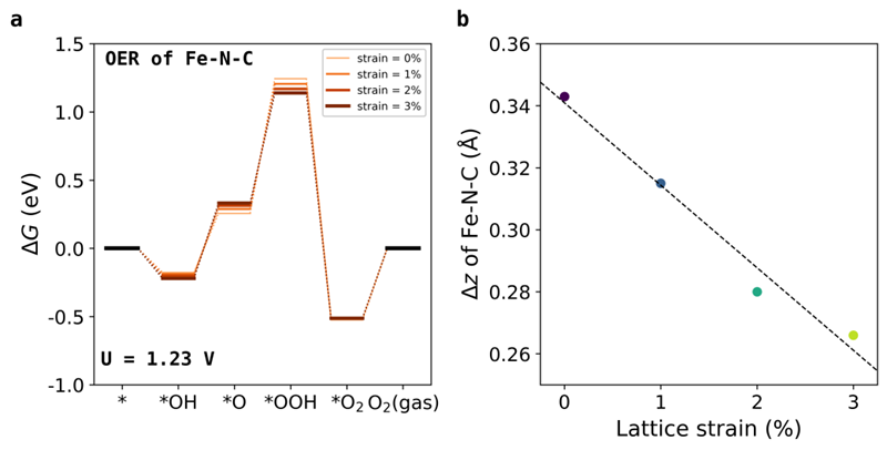 (b)Fe−N−C体系OER过程的*O中间态中,晶格应变与z方向位移的关系。