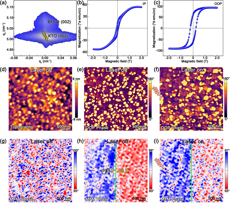 研究小组设计并利用脉冲激光沉积技术制备了多种BiFeO3基薄膜,通过压电力显微镜、磁力显微镜和球差校正透射电镜等多种技术的有机结合,研究了BiFeO3基薄膜中畴组态的外场响应行为。研究发现405 nm的激光激励会诱导薄膜中特定铁电分量的定向、可逆的铁弹翻转行为(如图1),分析认为是光生电场和异质界面的对称性失配两方面协同作用的结果;另外,结合电场和激光两种激励可设计实现多种可逆的极化翻转途径(见图2)。以上现象适用于不同应变态下、不同畴组态的BiFeO3基薄膜,如BiFe0.8Co0.2O3薄膜,其中铁电极化的翻转伴随着铁磁畴组态的显著变化(见图3),进而在室温下成功在BiFeO3基薄膜中实现了磁-电-光耦合行为。该项工作创造性地提供了一种实现多场驱动的磁电耦合的方法,对设计实现新型高性能电子器件具有重要意义。
