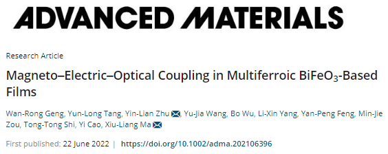 近日,松山湖材料实验室大湾区显微科学与技术研究中心的马秀良研究员、朱银莲研究员与耿皖荣博士及中国科学院金属研究所唐云龙研究员等人在室温单相多铁BiFeO3基薄膜中创造性实现了磁-电-光多重耦合行为。近日,Advanced Materials期刊以“Magneto–electric–optical coupling in multiferroic BiFeO3-based films”为题在线发表了该项研究成果。