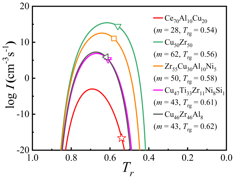 强脆性特征能够保障Ce-基非晶合金的快速弛豫接近理想玻璃态,但是,超稳性的获得还需要高的抗晶化能力,即能够阻碍弛豫过程中形核、结晶行为的发生。根据经典形核理论,我们比较了Ce-基非晶合金与其它合金体系的形核率大小。发现,强的液体特征和较大的Trg值促使Ce-基非晶合金拥有极低的形核率(图5),表现出一种可以与琥珀媲美的强抗形核能力。此外,通过超稳态Ce-基非晶合金有助于我们阐述一些经典的玻璃态物理科学问题,比如通过非对称退火实验发现超稳态Ce-基非晶合金可以到达平衡液态而不结晶,这支持了玻璃只有在弛豫完全结束后才会成核结晶的观点。
