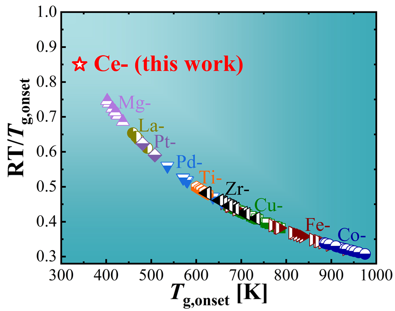 图2 室温下Ce-基非晶合金的老化效应显著强于其它非晶合金体系