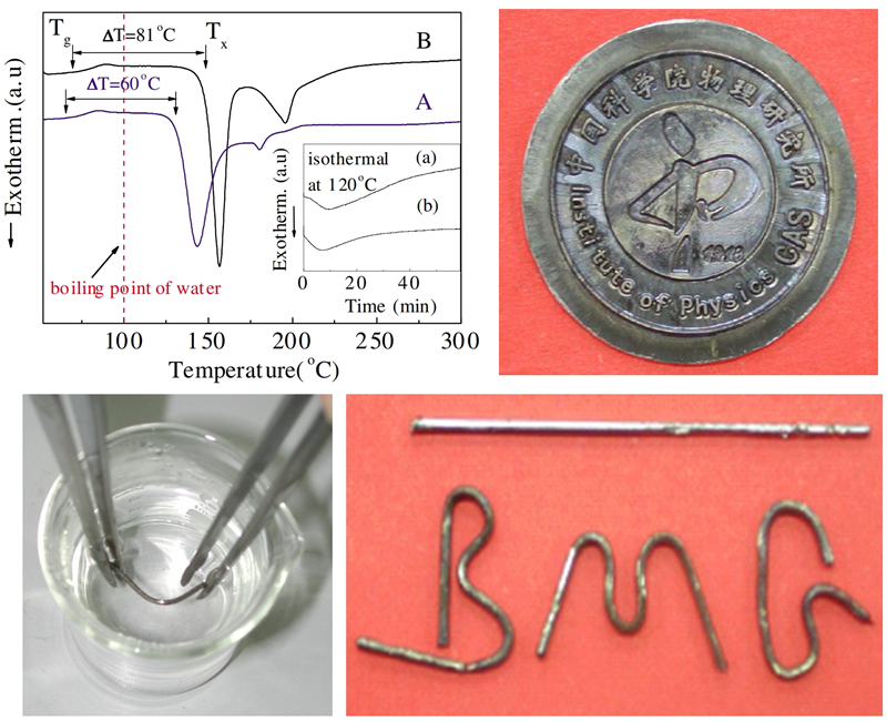 图1 具有低Tg点(~ 67℃)的Ce-基非晶合金,在开水中即可进行弯曲变形,又被称为金属塑料